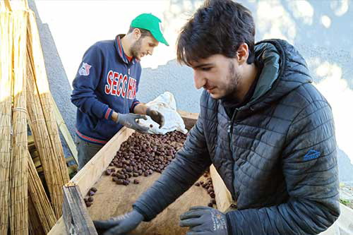 La raccolta viene effettuata a mano e a macchina. Normalmente si effettua la raccolta manuale nel momento iniziale, quando non ci sono molte castagne e nei punti più difficili da raggiungere con i macchinari.